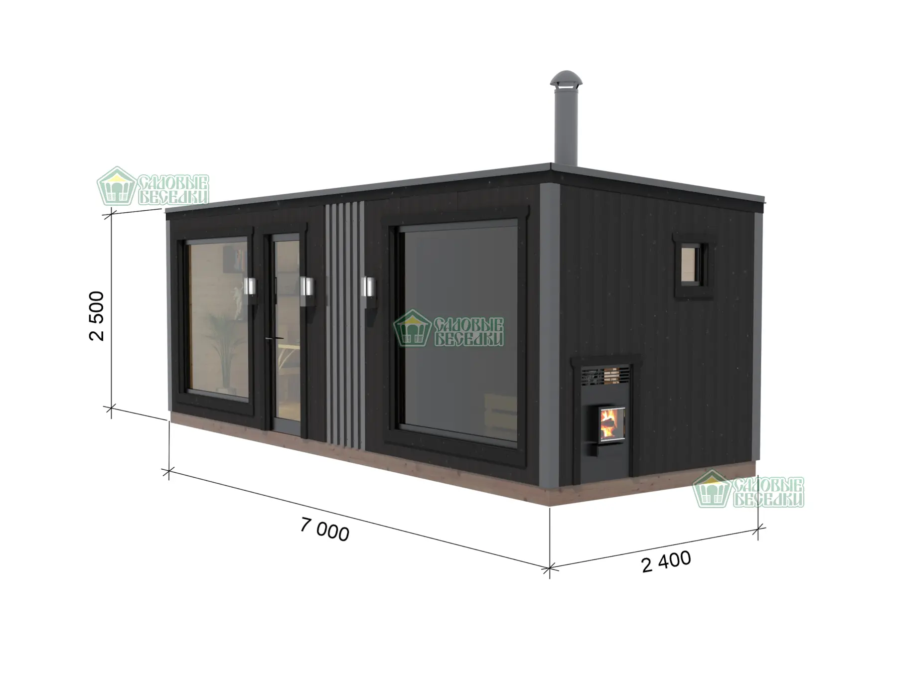 Баня с увеличенной комнатой отдыха состоит из трех основных секций: парная, душевая/помывочное отделение объединенное с раздевалкой, комната отдыха. Общая длина по основанию 7 метров, ширина 2,5 м. Конструкция рассчитана на комфортное размещение компании на 6-8 человек.