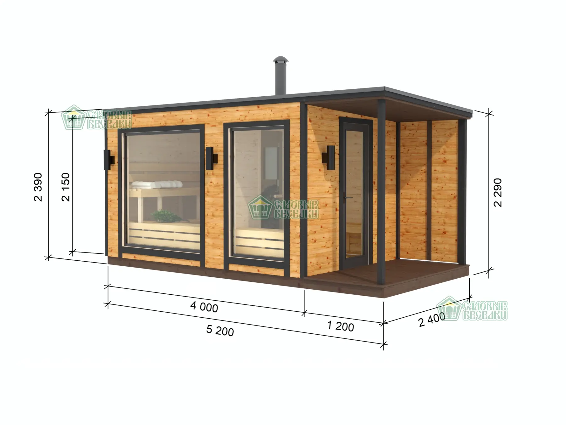 | Внутренняя обшивка | Осина (парная), сосна (душевая, комната отдыха) вагонка класса АВ камерной сушки |