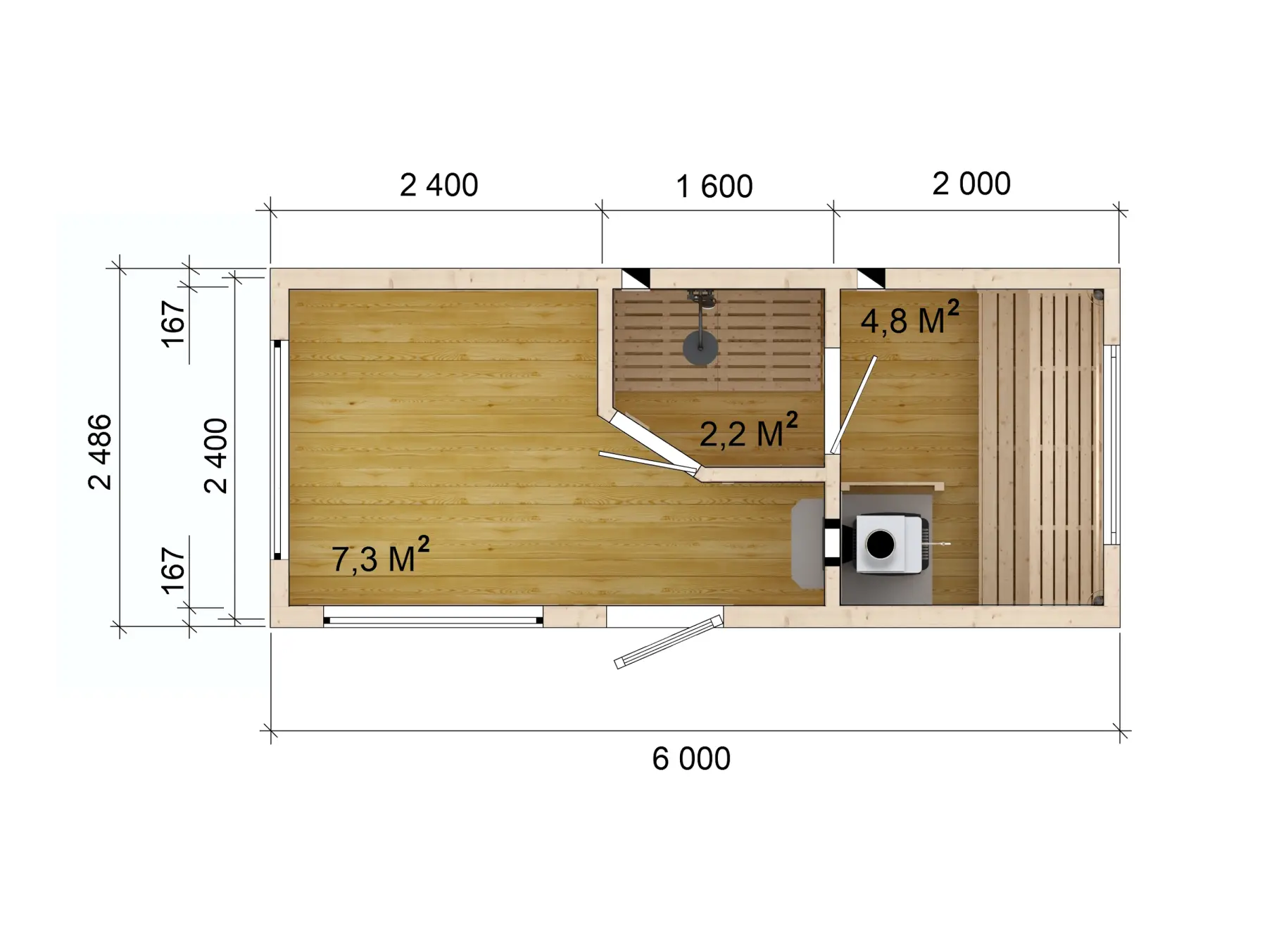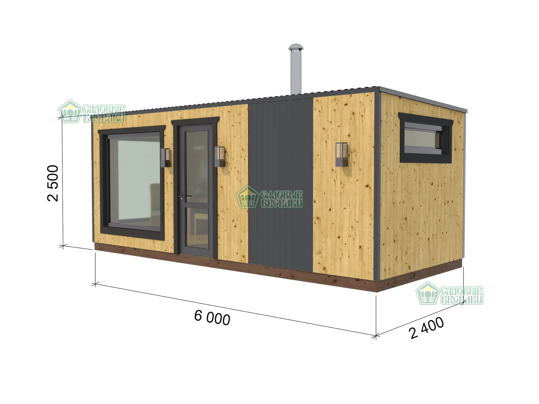 Баня в стандартных размерах 6х2,5 с большими панорамными окнами и душевой с угловым расположением дверного проема.