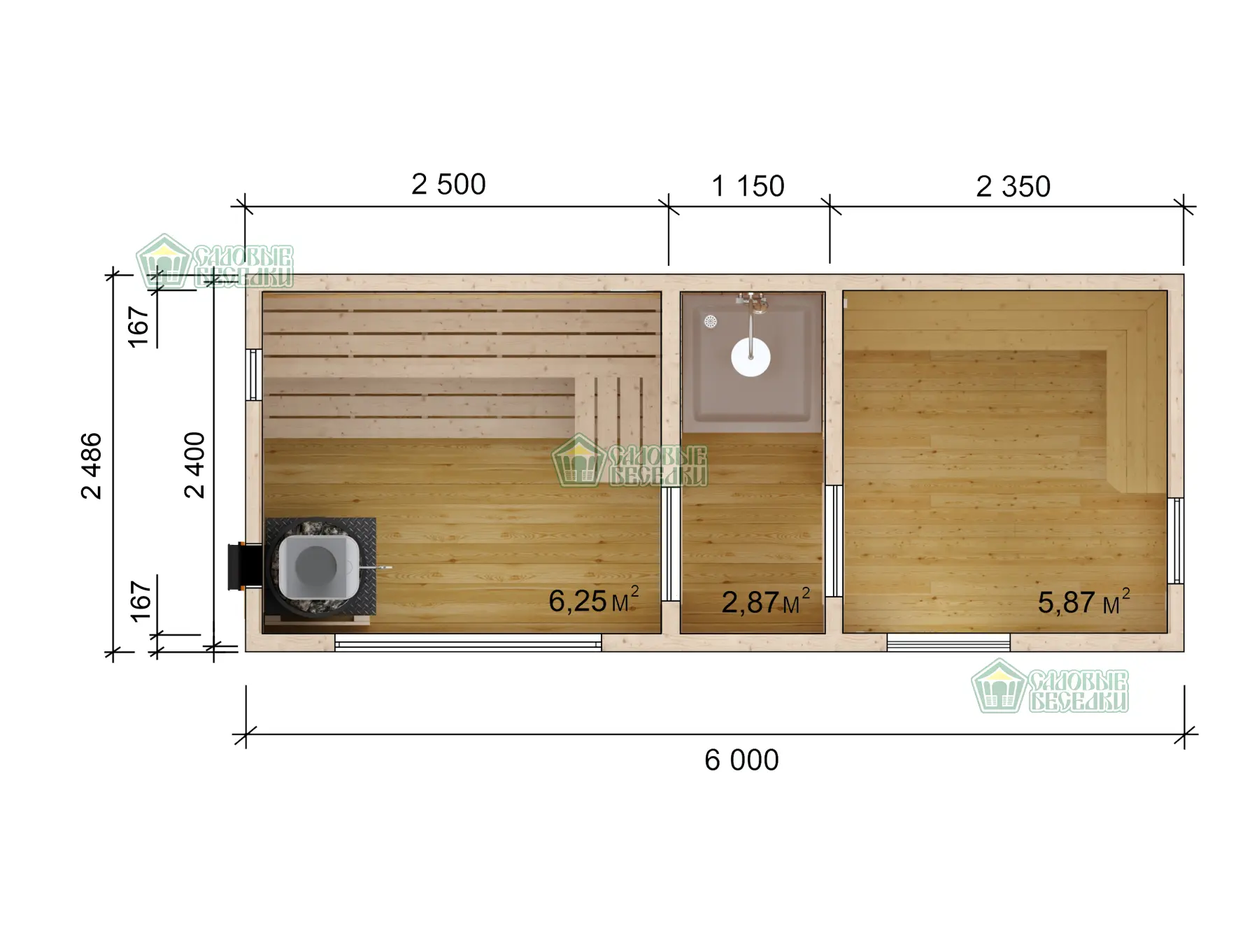 Классическая баня в стандартных размерах 6х2,5