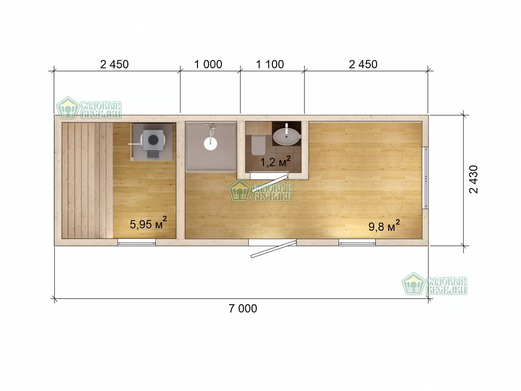 Отличительная особенность данной модели-увеличенная комната отдыха, отдельный санузел и душевая комната. Парная комната стены и поток сделаны по принципу термоса с использованием фольгированой пленки и обшиты осиновой вагонкой.