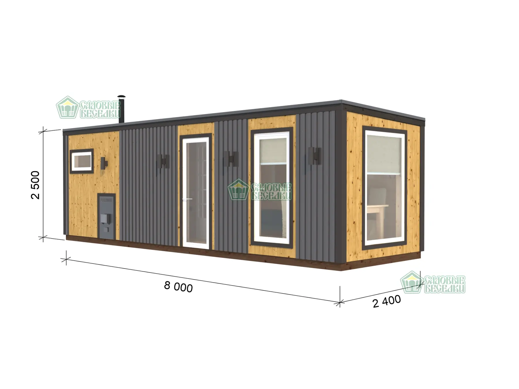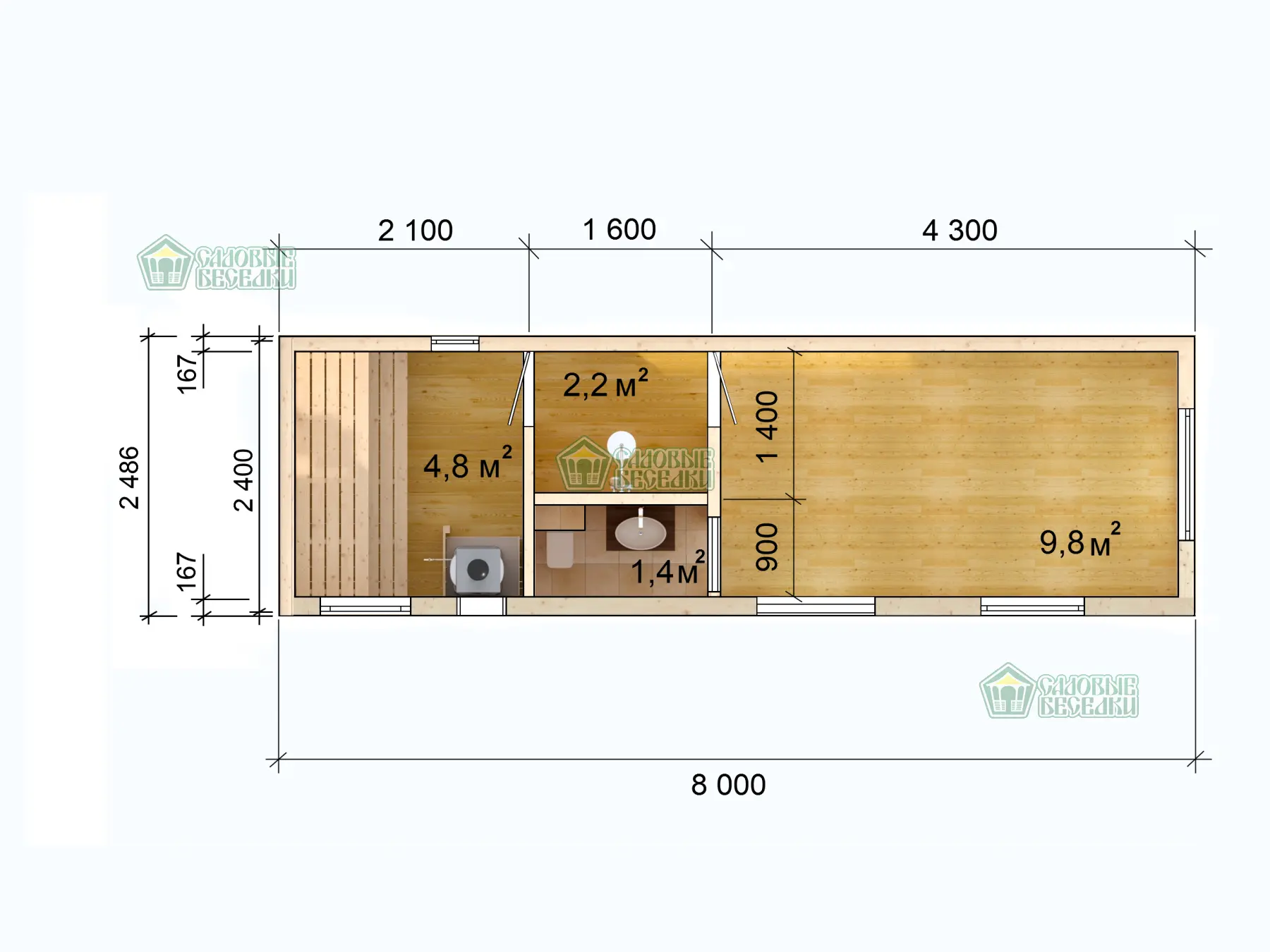 Особенность данной бани- увеличенная длинна до максимальных 8 метров, также увеличенная комната отдыха до площади 9,8м2, отдельно расположенный санузел и душевая комната совмещенная с раздевалкой. Парная и душевая комнаты -стены и поток сделаны по принципу термоса с использованием фольгированой пленки и обшиты осиновой и листвиничной вагонкой.