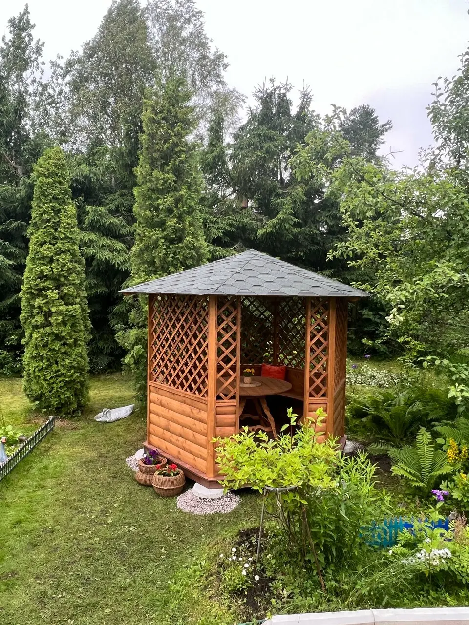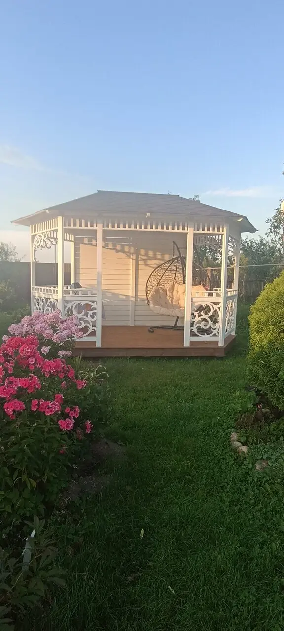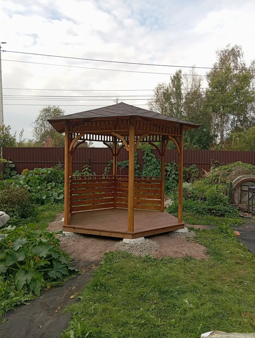 Наша семья благодарит всю команду "Садовые беседки", начиная с менеджера Евгения,и,заканчивая мастерами по сборке Егора и Кирилла, за отлично выполненную работу!Теперь наш участок украшает вот такая ажурная красота! Легко заказывать, никуда не нужно ехать, всё было сделано дистанционно, сроки и условия соблюдены.В нашем случае была внесена предоплата. Беседку установили на сваи, это было наше пожелание.Собирали часов 6.После сборки участок был абсолютно чистым! Ребята-молодцы весь строительный мусор прибрали.Этой компании однозначно можно доверять!Присматриваюсь теперь к аркам-перголам) Рекомендую всем " Садовые беседки "!