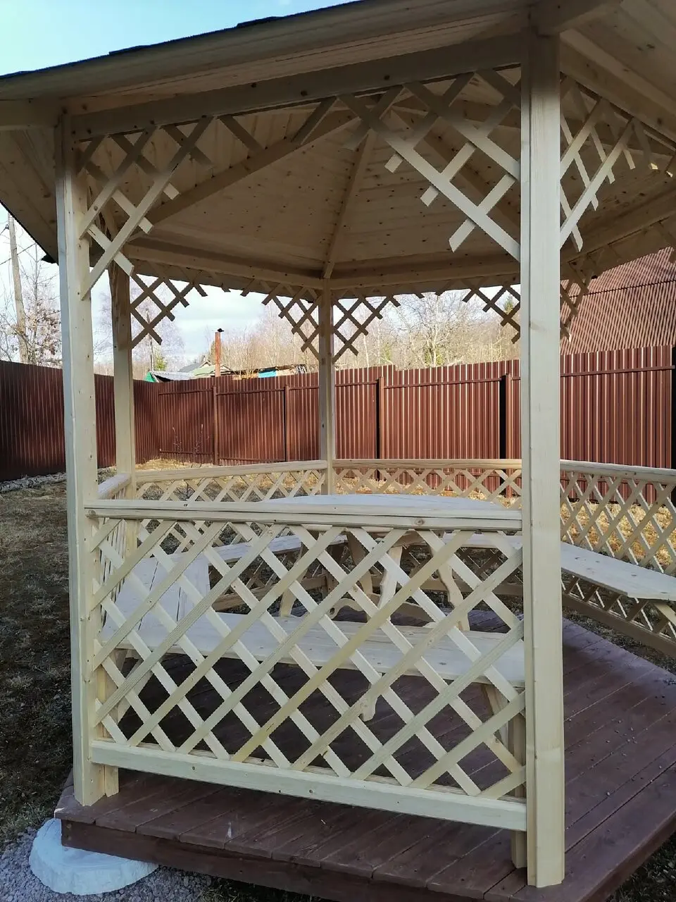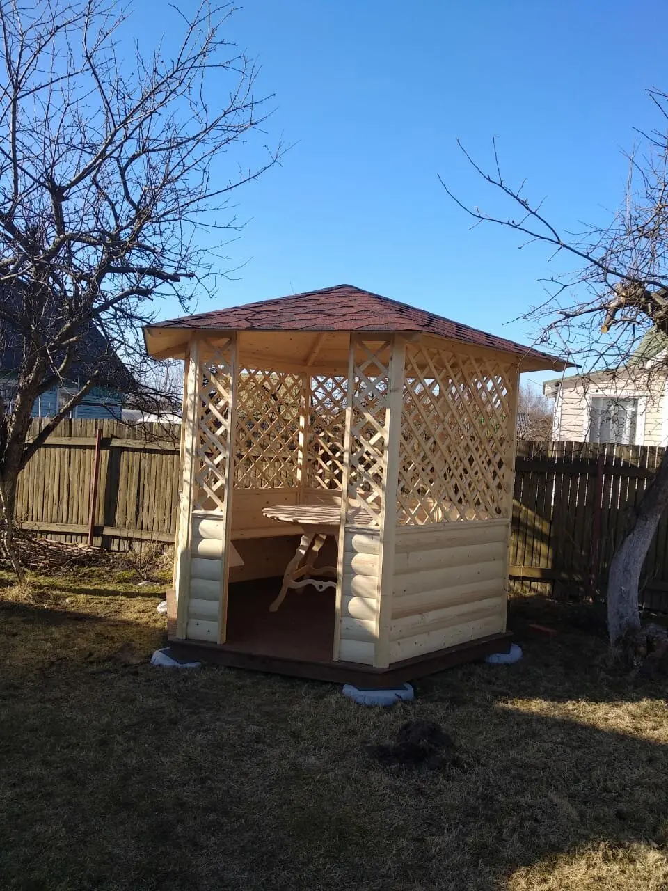 В прошлом году (2020 ) заказали беседку "Осень", ребята приехали, собрали, мусор за собой убрали. Работали без лишних разговоров, все четко. Мы довольны. Маленькое "Но" это то, что сверху с одной доски капала смола, ну похожа была на смолу. Подложили тряпочку, прокапало, перестало. Зиму беседка перенесла хорошо ничего не отвалилось все на месте. Менеджеру Виктории огромное спасибо за разъяснения и объяснения. Ощущение, что человечек работает и днем и ночью. За все еще раз большое спасибо. p.s площадку под беседку готовили мы сами.