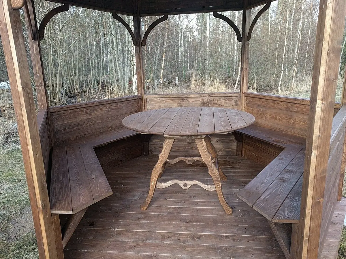 Хорошая фирма и хорошие беседки. Заказали в пятницу, получили договор и оплатили аванс в понедельник, а в четверг в 11, как договаривались, мастера уже были на даче. Приехали двое - Алексей (старший) и подручный Лёха. Алексей работал как робот - ни секунды передышки (на секунду оторвался один раз пса погладить). Лёха тоже помогал. К 14-30 всё было готово. Учитывая время на доводку основания и переноску деталей беседки, построили быстрее, чем за 3 часа. Всё аккуратно, красиво. Внутренняя часть крыши тоже покрыта террасным маслом. Стол как раз по размеру беседки - сидишь не слишком далеко и не вплотную. Стоит твёрдо, не качается.
